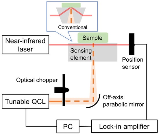 Figure 1 shows a schematic of the proposed PTDS system. The excitation light source was a quasi-continuous wave light from a tunable (wavenumber: 930–1200 cm−1) mid-infrared quantum cascade laser (QCL) (Hedgehog; Daylight Solutions, Poway, CA, USA) modulated by an optical chopper. The sample was irradiated from below the heat-sensing element. In conventional solid material evaluation systems using PTDS with visible light or near-infrared light, changes in the refractive index due to temperature increases in the air are utilized. However, in biomedical application systems using mid-infrared light, it is necessary to use a solid heat-sensing medium to securely fix soft samples such as skin. Furthermore, since the thermal optical coefficient dn/dT of common crystals and glasses that transmit mid-infrared light is significantly higher than that of air, it is possible to achieve high sensitivity.