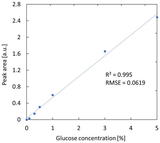 Figure 3 shows a calibration plot created using the absorption peak area at 1035 cm−1 from spectra obtained from glucose solutions with different concentrations (0.1–5%). A high degree of linearity between the peak area and concentration was confirmed and the coefficient of determination R2 for the regression line was 0.995, and the RMSE, which indicates the accuracy of the regression line, was 0.062. At this stage, the peak was observed in solutions with a glucose concentration of 0.3% or higher. A glucose concentration of 0.3% corresponds to a human blood glucose level of 300 mg/dL, but that sensitivity is still insufficient for detecting fasting blood glucose levels of approximately 80–200 mg/dL in healthy subjects. We are currently studying the optimization of the probe light incident position by simulation calculation to improve the sensitivity.