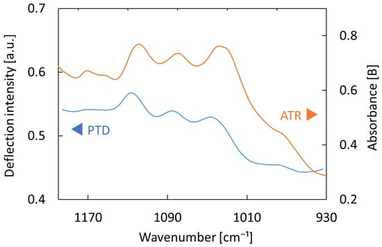Figure 4 shows a PTDS spectrum measured on the palm side of the wrist of a healthy adult subject. The measurement was performed using pure water as a reference, and both the measurement site and glass-sensing element were rinsed thoroughly with pure water to remove any sebum contamination before measurement. The absorption spectrum of the same measurement site obtained by the ATR method is shown for comparison. We confirmed that this method provided the same shape as the ATR method for biological samples. The spectral peak at 1030 cm−1 was attributed to keratinocytes, at 1078 cm−1 to stratum corneum tissue, and at 1120 cm−1 to lactic acid. All of these peaks were present in the stratum corneum and on its surface in both spectra. As the depth of light penetration of PTDS into biological tissues is estimated to be 20–30 μm [18], it should be able to detect components in interstitial fluid beneath the stratum corneum. However, the absorption levels of the interstitial fluid beneath the stratum corneum did not appear as distinct peaks in the spectra because they were much lower than that of the stratum corneum, as described above. Therefore, detailed spectral analysis using multivariate analysis is necessary for the study of blood components [24]. We have also applied spectral analysis using partial least squares regression (PLSR) for blood cholesterol analysis [25], and we also utilized machine learning methods such as random forests and neural networks for analysis of infrared absorption spectra of human subjects [26]. In addition, in PTDS targeting multilayered structures, there is the possibility of selecting the measurement depth by changing the modulation frequency [21].