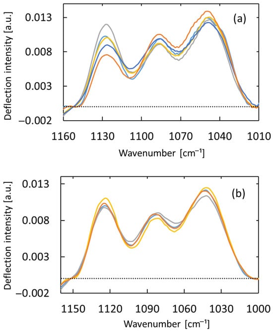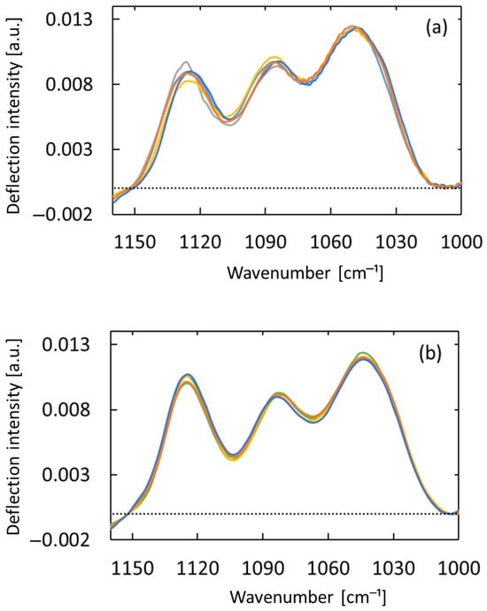 Figure 5 shows PTDS spectra of the wrist, which was measured five times in continuous measurements. Since baseline fluctuations occur in the measured PTDS spectra, the baseline correction has been performed in the 1005–1152 cm−1 range to compensate for this. The baselines are shown as dotted lines in Figure 5 and Figure 6. The spectra have been normalized by the area between the line and the spectra. The results showed almost the same measurement reproducibility for both horizontal and total reflection paths.