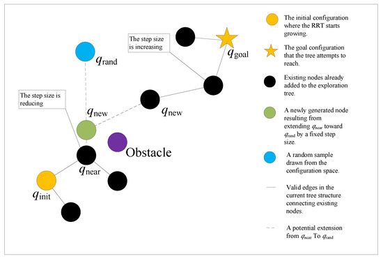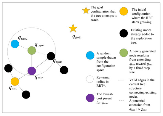 RRT* is an enhanced version of the standard RRT algorithm [31]. While the traditional RRT connects each newly generated node directly to its nearest neighbor in the tree, RRT* introduces an optimization step that significantly improves the quality of the resulting path. Instead of blindly attaching the new node to the closest existing node, RRT* searches within a defined neighborhood around the new node to evaluate potential parent nodes. It then selects the parent that results in the lowest cost path to the root in terms. This re-wiring process allows RRT* to refine the path over time. As a result, RRT* not only ensures path feasibility but also enhances path optimality compared to standard RRT. The specific mechanism of RRT* is illustrated in Figure 2.