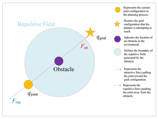 In joint space, simply adjusting a single joint angle does not achieve the same “pushing away” effect as in Cartesian space, and may even lead to movement directions contrary to the desired obstacle avoidance behavior. Therefore, it is necessary to redesign and adjust the form and action mechanism of the repulsive force function to make it suitable for path planning in high-dimensional joint space.