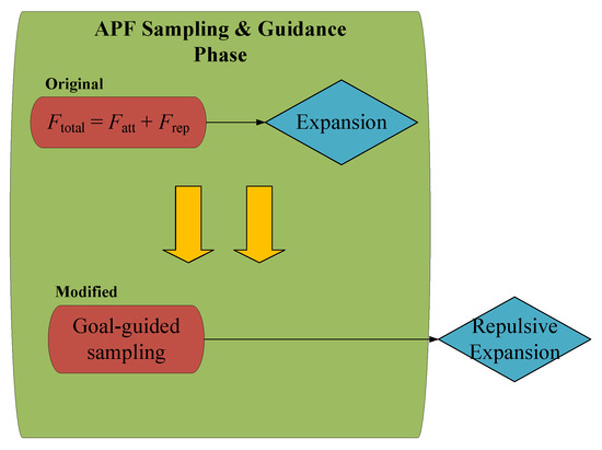 Recent studies have proposed several improvements to overcome these issues, such as integrating APF with sampling-based methods, dynamic repulsive fields, or adaptive potential functions. These strategies aim to retain the efficiency of APF while improving its global planning capability [20,21]. Inspired by this line of work, our algorithm incorporates a modified APF module to guide local sampling and enhance obstacle avoidance.