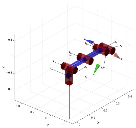where denotes the position of the i-th joint in the world coordinate frame, and are its Cartesian coordinates. Each represents the homogeneous transformation matrix from frame to frame k, determined by the joint variable . The cumulative transformation from the base to the i-th joint is obtained through the ordered product . The resulting transformation is applied to the local origin point , and the final position is extracted by projecting the resulting homogeneous vector using the projection matrix , where denotes the identity matrix.