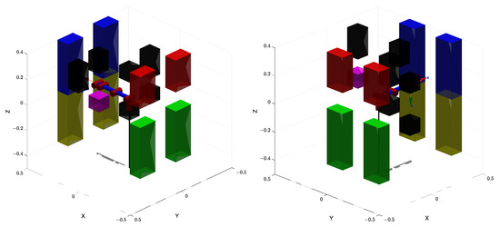 In this study, the base of the manipulator is placed in the center of an obstacle cluster on the map, with the objective of evaluating the algorithm’s performance in obstacle avoidance and path planning from an initial pose to a specified target pose. Two different simulation environments are designed, both within a 50 cm × 50 cm × 50 cm grid space. The first environment features a complex cluster of small obstacles, while the second includes a narrow entrance, simulating challenging terrain and confined spaces commonly encountered in real-world scenarios. All experiments are conducted on a Windows 10 operating system, running on a hardware platform equipped with a 12th Gen Intel Core i7-12700KF processor (base frequency 3.6 GHz) (Santa Clara, CA, USA) and 32 GB dual-channel DDR5 memory.