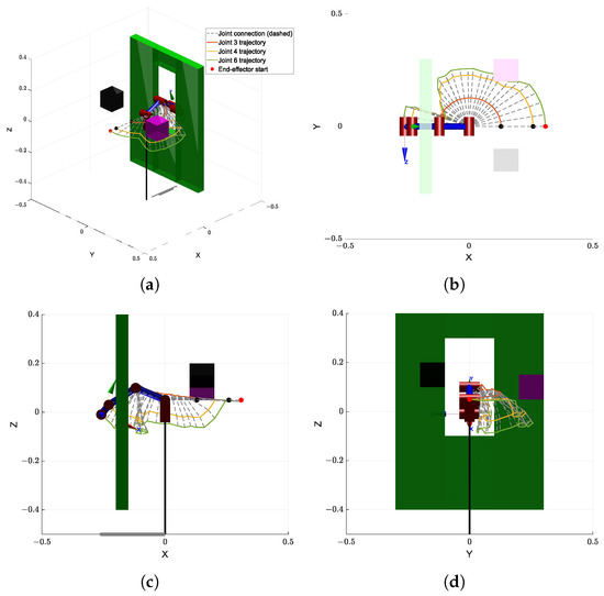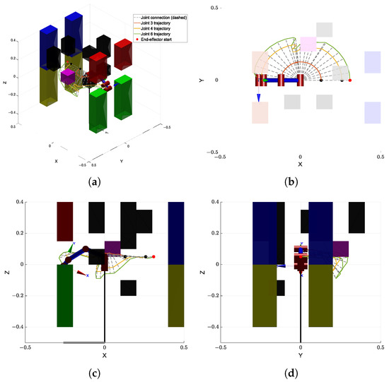 The output trajectories generated by the proposed GBAPF-RRT* algorithm are illustrated, based on the environment setup of Simulation 1. The manipulator is shown at its final goal configuration. Each node of the RRT tree is connected by gray dashed lines to represent the manipulator’s link configurations along the planned path. The orange, yellow, and green solid lines correspond to the trajectories of joint 3, joint 4, and joint 6 (end-effector), respectively. A red dot marks the initial position of the end-effector. The subfigure (a) provides a general 3D perspective, while subfigures (b–d) show the same trajectory projected onto the X–Y, X–Z, and Y–Z planes, respectively.