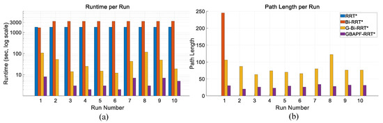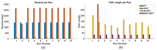 Figure 9a shows the comparison of runtime performance across different algorithms in this simulation environment. The proposed GBAPF-RRT* algorithm clearly outperforms the baseline methods in terms of computational efficiency, demonstrating faster convergence and significantly reduced computation time, particularly in complex obstacle scenarios. These results highlight the effectiveness of the guided sampling strategy and the enhanced node expansion mechanism.