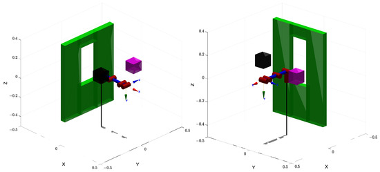 The second simulation scenario is designed in an environment featuring a vertical structural obstacle with a rectangular opening, as shown in Figure 10. The corresponding planned trajectories are visualized in Figure 11. This setup is intended to simulate realistic operational conditions where a manipulator must reach through constrained passages or apertures in structural elements. Such environments are commonly encountered in industrial tasks involving access through maintenance windows, workstation cutouts, or openings in protective housings for tasks such as assembly, inspection, or pick-and-place operations.