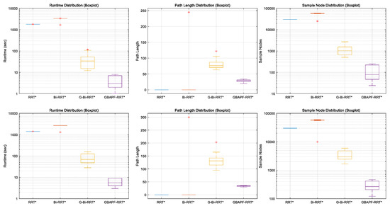 To further analyze the stability and variance of different algorithms, boxplots of runtime, path length, and sample nodes are presented in Figure 13. The top row corresponds to Simulation 1, while the bottom row shows the results from Simulation 2. From the plots, it is evident that GBAPF-RRT* not only achieves the lowest median runtime but also exhibits the smallest interquartile range in both maps, indicating high stability and consistency. In contrast, G-Bi-RRT* displays a larger variance in runtime and sample nodes, especially in the more complex Simulation 2 scenario. The classical RRT* and Bi-RRT* perform poorly in both success rate and path quality, as reflected by their zero-valued distributions. Overall, the boxplots further validate the effectiveness and robustness of the proposed method across different environments.