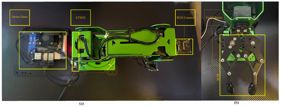 To evaluate the practical feasibility of the proposed algorithm for collision-free motion planning in real-world environments, a series of physical experiments were conducted. The experimental platform consists of a common commercially available 6-DOF robotic manipulator, characterized by sufficient kinematic flexibility, precise joint control, and a moderate payload capacity, making it suitable for validating high-dimensional planning strategies. The manipulator is equipped with a Jetson Nano onboard computer (NVIDIA Corporation, Santa Clara, CA, USA) running Ubuntu 18.04. Additionally, an RGB camera was originally mounted on the end-effector to localize target objects. However, the camera module was removed during the experiments in order to minimize the end-effector volume and improve clearance in confined spaces. The final size of the end-effector was approximately 8 cm × 5 cm × 5 cm. An illustration of the robotic platform is shown in Figure 14.