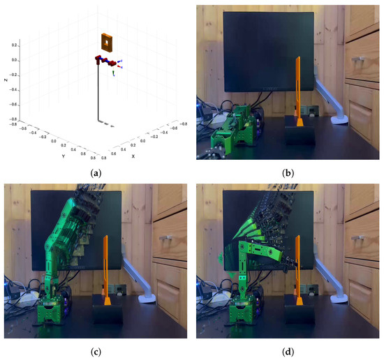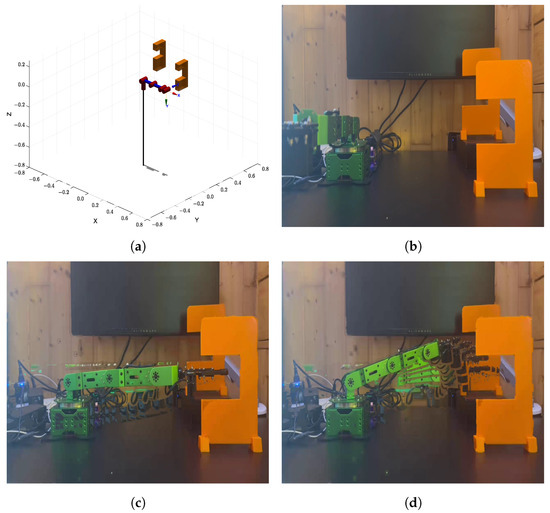 (a) Modeled environment 2 in MATLAB. (b–d) Sequential snapshots of the manipulator executing the planned trajectory in the real-world environment.