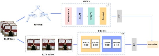 In this study, we introduce a dual-modality SLR method that integrates data from both skeleton and RGB image modalities. The overall architecture is shown in Figure 1. The first modality employs a Multi-Stream Spatio-Temporal Graph Convolutional Network (MSGCN) model to process both temporal and spatial dimensions of skeleton data. The second modality utilizes a deformable convolution-based 3D ResNet (D-ResNet) model to analyze spatial and temporal patterns from raw images. A late fusion layer combines the outputs of these two pathways to enhance the overall performance of the model.