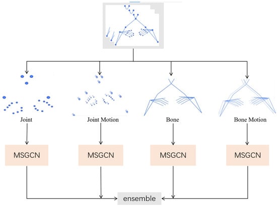 An illustration of the fusion of multi-stream skeleton features: the skeleton data of the four streams are fed into the MSGCN model separately for processing, and the resulting features are fused.