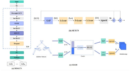 In summary, the basic unit of the MSGCN mainly consists of decoupling GCN, SJAM, and SETCN. A batch normalization layer and a ReLU activation function layer are added after each module. The use of residual connections between the modules can make the training more stable. The MSGCN module, which consists of 10 basic units, is adopted successively. Finally, a linear connection layer is applied to achieve the standard multi-class classification using the softmax activate function. The process is shown in Figure 3a.