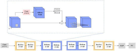 A raw RGB image itself contains a lot of spatio-temporal information. Traditionally, 3D CNNs have been employed to extract these features for SLR. But they are computationally intensive and prone to overfit. To solve this problem, we propose a deformable convolution-based 3D ResNet (D-ResNet), which uses a ResNet2+1D network [48] as the basic architecture of the model. Compared with 3D CNNs, ResNet2+1D has the advantage of its ability to decompose spatio-temporal features into 2D spatial features and 1D temporal features, and this decomposition is able to both effectively capture the video’s spatio-temporal information and at the same time make the model more lightweight and reduce the computational cost. In addition, deformable convolution [49] can dynamically adjust the shape and position of the convolution kernel, improving adaptability to variations in movement and background, thereby enhancing SLR accuracy. So, we combine 3D deformable convolution in the last two layers of the model to improve the accuracy of SLR recognition.