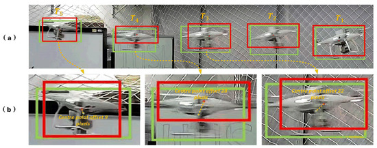 Schematic diagram of visual localization error analysis. (a) Detection effects during typical phases of UAV continuous motion: The UAV performs a horizontal “acceleration-constant velocity-deceleration” maneuver. Phases – exhibit significant rightward acceleration, while phases – transition to deceleration with sustained rightward motion. Detection results are visualized through dual markers: Red bounding boxes represent real-time outputs from a well-trained YOLOv5 model [18], and green ground-truth boxes denote professionally annotated references. Their centers are marked by red and green dots, respectively, where spatial offsets directly reflect localization errors. (b) Spatiotemporal comparative analysis of the – deceleration phase: Jitter in bounding boxes caused by motion blur and sensor noise is quantified. Smaller jitter occurs at slower UAV speeds, while rapid motion induces severe jitter, with pixel offsets of bounding box centers reaching 20–30 pixels.