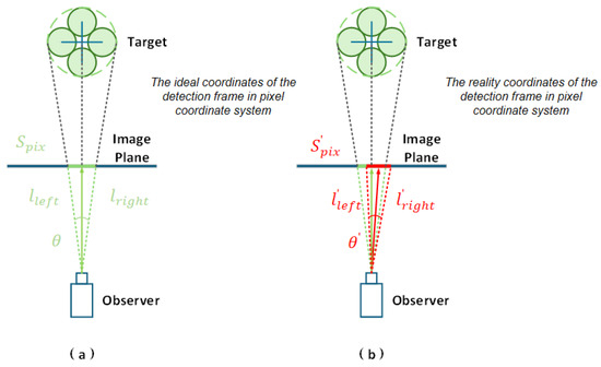 Bounding frame without noise influence and without jitter in the pixel coordinate system under ideal conditions (as shown in (a) in the figure). In reality, the bounding box is disturbed by noise, and the left and right boundary positions of the bounding box, the position of the center point, and the size of the boundary fluctuate (as shown in (b) in figure), which in turn affects the observed values of Bearing and Angle.