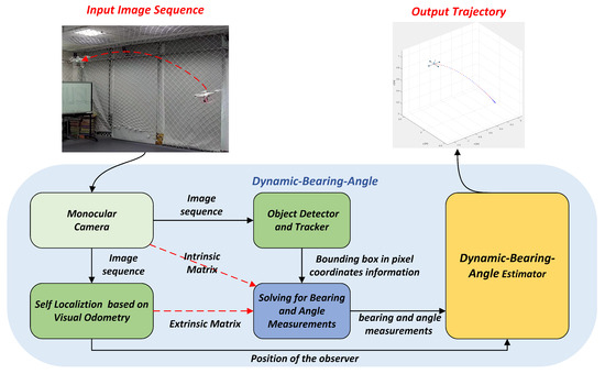 Overview of Dynamic Bearing–Angle. The Dynamic Bearing–Angle algorithm firstly captures the target image sequence by a monocular camera, extracts the target bounding box information by using the 2D target detector and tracker, and at the same time parses the VIO self-localization information according to the image sequence acquired by the observer. Then, the azimuth and angle measurements of the target are calculated by combining the internal and external reference matrices of the camera, the VIO self-localization information of the observer, and the target bounding box information. Finally, the measured values are input into the target motion estimator to predict the target’s motion trajectory information.