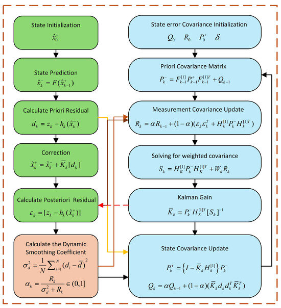 - Initialization step: In the initialization step, we need to establish the initial process noise covariance matrix and measurement noise covariance matrix , as well as the initial state estimate and state covariance matrix . Here, “+” indicates that the estimate is a posteriori. Also, we initialize the M-estimation parameter .