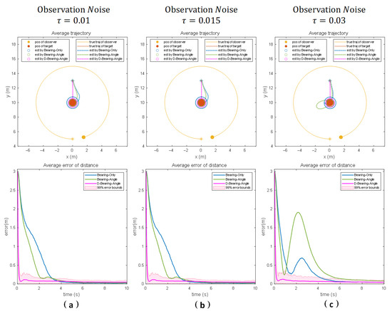 The motion scenarios are the results of numerical simulations for 100 Monte Carlo runs for three different noise scenarios when the observer moves in a circle around the target (Columns (a–c) show the experimental results for different noise intensities, respectively). The “*” denotes the initial position, the solid line denotes the true trajectory, the dashed line denotes the estimated trajectory, the solid circle denotes the observer and the target, and the hollow circle denotes the estimated target position. The second row of the figure shows the average distance error, which is used to measure the estimation error of the distance between the observer and the target.