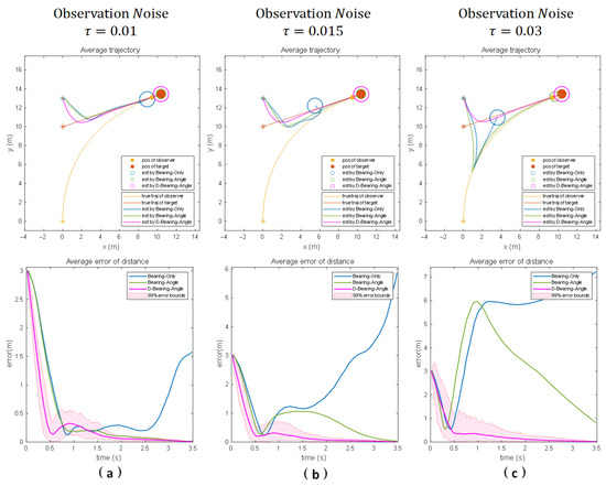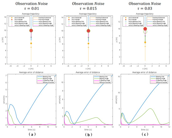 Figure 7a illustrates the estimation results of each algorithm in Scene 3 in motion and with a standard deviation of 0.01 in the observation noise. It can be seen that both Bearing–Angle and Dynamic Bearing–Angle successfully converge before the collision occurs. Due to the small lateral motion of the observer and its weak observability, Bearing-Only is completely unable to estimate the state of the target. When we increase the observation noise to 0.015 and 0.03 (as shown in Figure 7b and Figure 7c, respectively), Bearing–Angle is affected by the larger noise, and although there is a tendency to converge eventually, the localization accuracy fluctuates to a greater extent with the noise increase in the process. In contrast, the Dynamic Bearing–Angle algorithm proposed in this paper always maintains high robustness and localization accuracy and is less affected by noise.