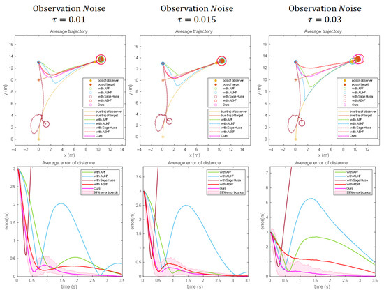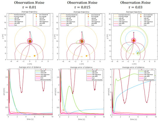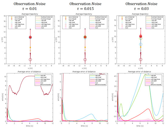 Figure 5a demonstrates the estimation knots of each algorithm under motion scenario 1 and that the standard deviation of observation noise is 0.01. At this time, the observation noise is small, the observation error of the system has a relatively limited impact on the performance of the algorithms, and the average distance errors corresponding to the three algorithms are kept small. From the figure, we can observe that the Dynamic Bearing–Angle response is the fastest, which may be the case when the noise is small or the system state changes slowly, and the dynamic tuning may allow the filter to obtain better estimation results without a large number of iterations.