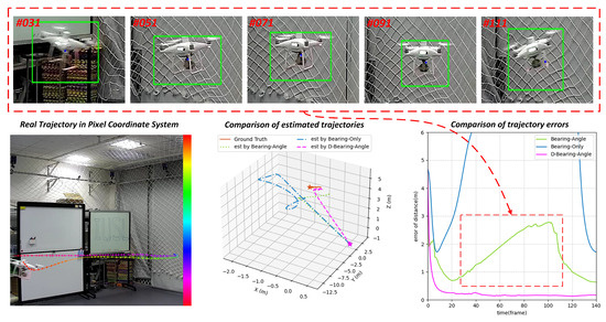 The experimental results show that the Dynamic Bearing–Angle algorithm significantly outperforms the Bearing-Only and Baseline–Angle methods in estimating the target position in all frame intervals in the comparative tests on the MAV6D dataset. In the initial stage, the algorithm has a fast response speed and good adaptability to noise, and it can stabilize the estimation error faster than the traditional methods; in the high-speed maneuvering scenario, the dual-robust mechanism effectively deals with the dynamic noise such as the detection frame jitter and continuously maintains the error convergence; in the process of long-time tracking, the algorithm maintains a low level of error by dynamically adjusting the noise covariance and the suppression of the outliers, while the other methods show obvious fluctuation of the error with the passage of time. The experimental results fully verify the strong robustness of the algorithm to noise in real complex scenes and the stability of long-term estimation.