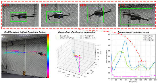 As shown in the visualization results of Figure 11, in the low-speed motion scenario of the drone, Bearing-Only fails to converge due to insufficient state observability caused by the lack of lateral acceleration modeling. While Bearing–Angle converges rapidly in the early stage, the PLKF (Pseudo-Linear Kalman Filter) it employs introduces approximation errors due to the truncation of high-order terms during pseudo-linearization. When the bounding box jitter exceeds the critical threshold, accumulated errors can cause systematic deviations in the estimated trajectory. Even small random offsets in the detection bounding box can lead to a decline in the robustness and estimation accuracy of the Bearing–Angle algorithm due to long-term noise accumulation. In contrast, the Dynamic Bearing–Angle algorithm significantly enhances adaptability to random noise fluctuations by introducing an adaptive dynamic Kalman filtering mechanism, which effectively tracks time-varying noise characteristics.