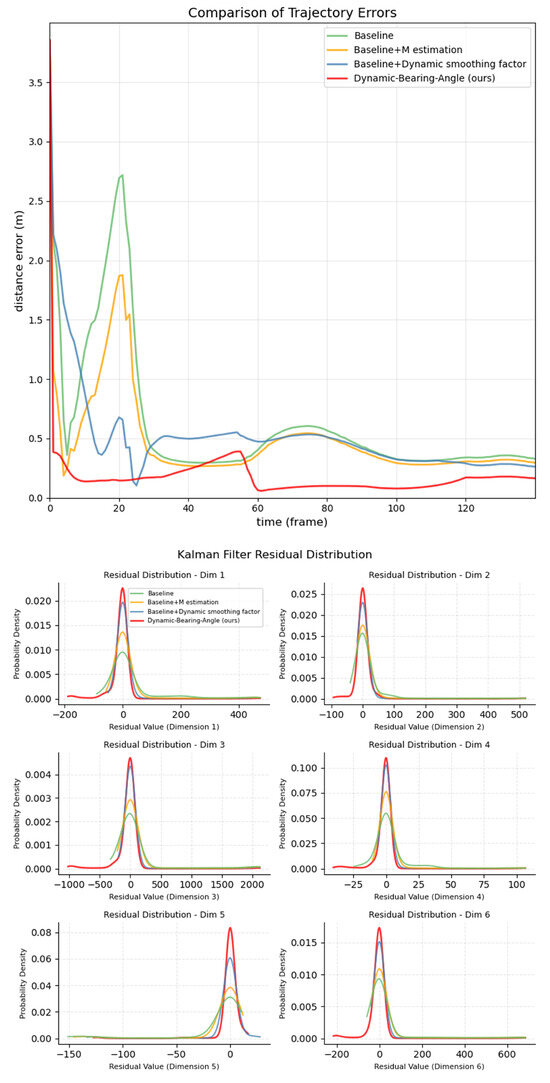 To further elucidate the capability of each module in handling estimation errors, we compared the residual probability density functions generated during the filtering process of four methods in one case, with the results presented in Figure 13.