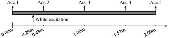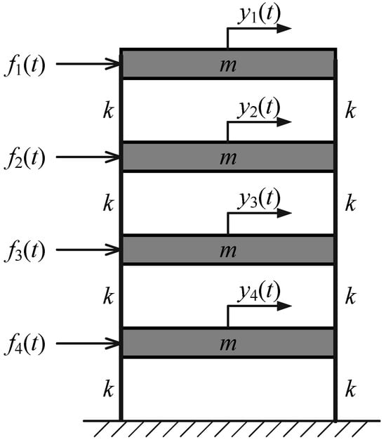 A four-degree-of-freedom (4-DOF) shear frame, as shown in Figure 1, is used to validate the proposed method. The mass of each story is 2 kg and the shear stiffness of each column is 2500 N/m. In this model, the proportional damping matrix is adopted, with and designating the mass and stiffness matrices, respectively. The theoretical modal parameters of the frame model are computed from , and and used as baseline values for evaluating the accuracy of the proposed method. Table 1 gives the theoretical modal parameters of the frame model.