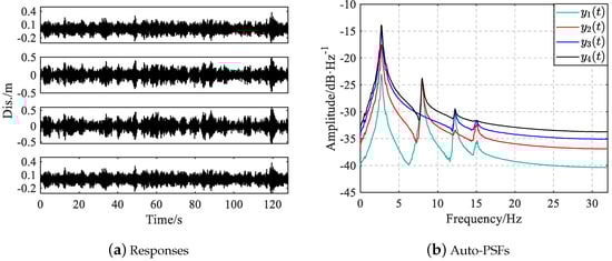 The frame is subjected to uncorrelated zero-mean Gaussian white noise excitation with a standard deviation of 100 N at each story in the horizontal direction. The displacement responses of the frame are computed using Newmark- method with a constant time step of 0.001 s over 16 s and then resampled with 64 Hz. In addition, the uncorrelated zero-mean Gaussian white noise sequences are added into resampled responses to simulate measurement noise with SNR 20 dB. The full PSD matrix of responses is first calculated using Welch’s method with a Hamming window of 256, 50% overlapping and Fourier transform of 256 data points; the PSD functions are then transformed to correlation functions with inverse Fourier transform; subsequently, the negative part of correlations is set to zero and finally, the PSF functions are derived by applying Fourier transform to reshaped correlations. The responses and its auto-PSFs in a typical simulation are given in Figure 2.
