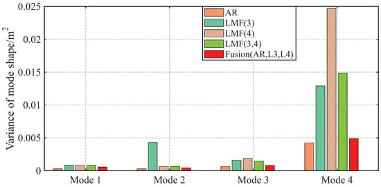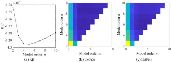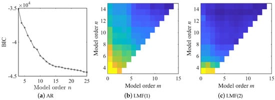 In this example, the BIC is employed to determine the model orders for both AR and LMF models. As illustrated in Figure 3, the BIC value achieves its minimum value at for the AR model. In contrast, for the LMF model, no abrupt changes in the BIC value are observed at and as the model orders are increased. Consequently, the model order for the AR model is selected as 5, while model orders and for the LMF model are determined. The identification results obtained with different methods are finally fused by the method proposed in Section 2.5. Throughout this example, the first component of the mode shape vectors is scaled to unity.