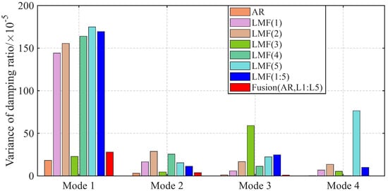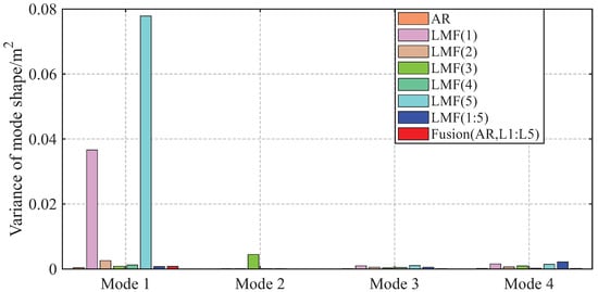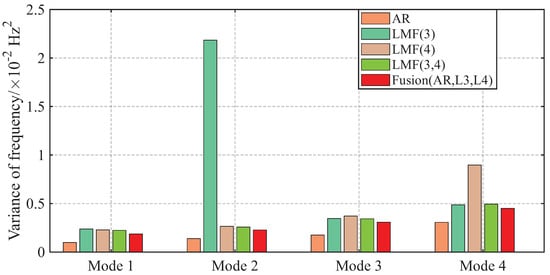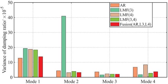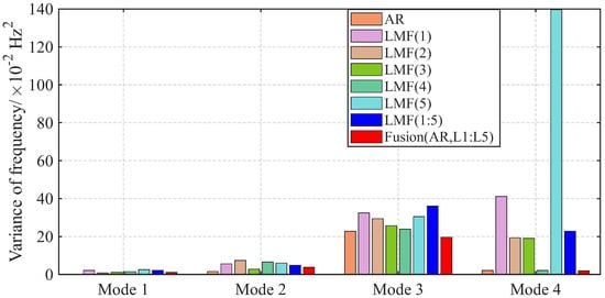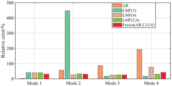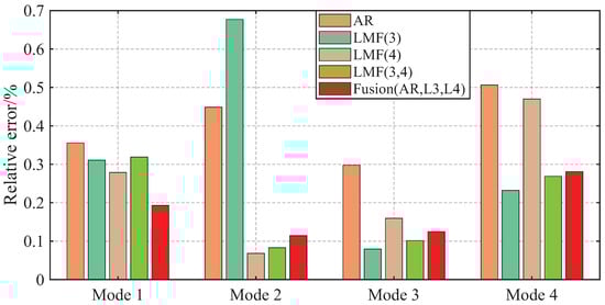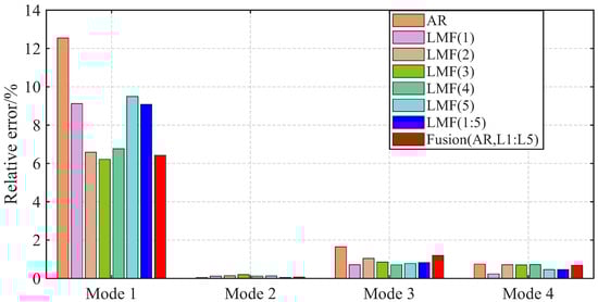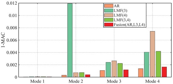 The AREs of the modal frequencies and damping ratios identified by different methods over 1000 simulations are depicted in Figure 4 and Figure 5. The averaged Modal Assurance Criterion (MAC) values between the identified mode shape vectors and the baseline values are given in Figure 6. For ease of notion, LMF means that the modal parameters are identified using the LMF model with the specified columns of the PSF matrix, while Fusion(AR,Li,Lj) is the method fusing the results of the AR, LMF, and LMF models.
