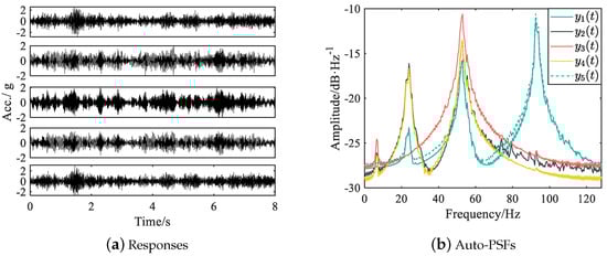 Operational modal analysis (OMA) is extensively applied in structural engineering to extract modal parameters (i.e., modal frequencies, damping ratios, and mode shape vectors) of structures from dynamic responses [,,]. The OMA techniques can be categorized into time- and frequency-domain methods [,,,].