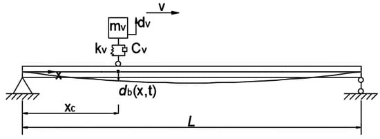 As shown in Figure 1, a vehicle–bridge system is represented as a continuous uniform bridge subjected to a moving vehicle. For the vehicle–bridge interaction analysis, common vehicle models include the quarter-vehicle, half-vehicle and full three-dimensional vehicle models. This study’s aim is to develop a method to extract the time-varying characteristics from the dynamic responses of a beam bridge under a moving vehicle. The vertical motion of the vehicle’s center of mass and the tire point is the key factor. So the single-axle vehicle model is adopted in this study. The vehicle is assumed to travel along the longitudinal direction of the bridge at a constant speed . The simply supported bridge is modeled using the finite element model. The Equations of motion for the bridge and vehicle subsystems can be expressed as follows []: