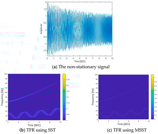 SST can provide a time–frequency analysis for signals when the signal is well-separated with slow variations. Compared with STFT, SST can yield a clear time–frequency representation. When the signal variation is large, SST may not be able to provide an accurate and clear time–frequency representation []. Multi-synchrosqueezing transform (MSST) is used to execute multiple SST operations for achieving an even sharper time–frequency representation as []