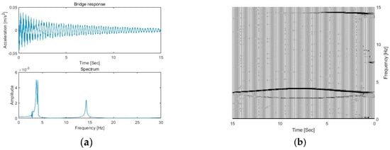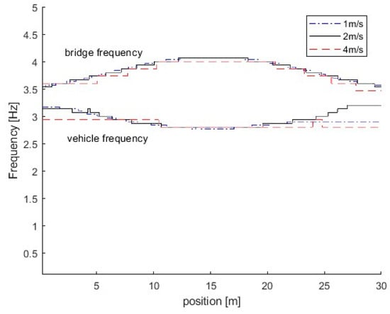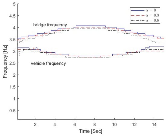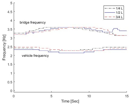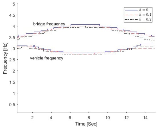 To understand the time-varying characteristics of the VBI system, the bridge is considered as a uniform Euler beam. Assuming , the VBI system becomes uncoupled. The analytical solutions of instantaneous frequencies for the vehicle and bridge are given as shown below []. When the natural frequency of the vehicle is larger than the first natural frequency of the bridge , the analytical solution is