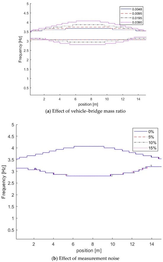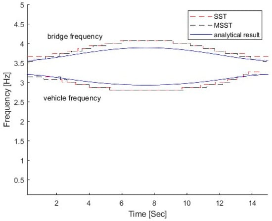 In this section, the proposed MSST is used to extract the time-varying characteristics of VBI systems. The vehicle–bridge mass and frequency ratios have a significant effect on the time-varying characteristics of the vehicle–bridge interaction systems due to their coupling effect []. To demonstrate the performance of the proposed method, the proposed method is used to extract time-varying characteristics due to the vehicle–bridge coupling effect in this section. Except for what is specified in the sections, other parameters of the vehicle–bridge interaction system are the same as that in Section 3.1.