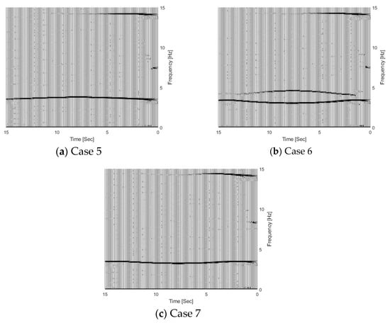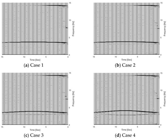 Figure 5 shows the TFRs of the bridge responses with different vehicle–bridge mass ratios, and 5% noise has been added in the calculated response. According to Equation (5), the trajectories above and below 3.55 Hz in the figure correspond to the bridge and vehicle dynamic components, respectively. From Figure 5, the bridge frequency components above 3.55 Hz are highlighted, which means that the bridge dynamic component is dominant in the dynamic responses of the bridge subjected to a moving vehicle. Comparing four cases in Figure 5, the vehicle frequency component becomes dark when the vehicle–bridge mass ratio increases. The results show that the energy of the vehicle dynamic component in the bridge response increases with the vehicle–bridge mass ratio.