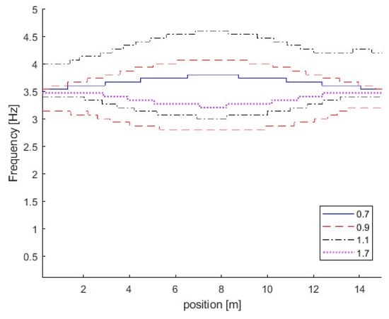 In this section, three damage locations are studied, e.g., Other damage parameters are , , and m = 2.0. The parameters of the VBI system are the same as those in Section 3.1. In total, 5% is added to simulate measurements. Figure 16 shows the IFs from the dynamic responses of the bridge with different damage locations. The same as in Section 3.3.2, the top IFs correspond to the bridge frequency component and the bottom ones relate to the vehicle frequency component. From the figure, there is a large variation in the bridge frequency component at the damage location. For the case with the damage at 1/4 L, the bridge IF exhibits a frequency variation at 1/4 L. The frequency variation is observed around 3/4 L for the case with the damage at 3/4 L. This is due to the local response being excited when the vehicle is passing over the damage location. The local response is very sensitive to the damage. The local frequency variation could be used to localize the damage.