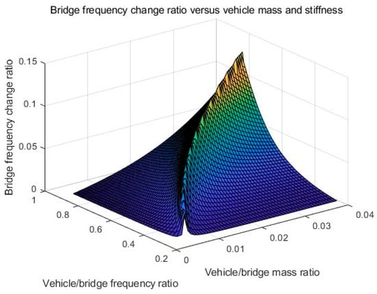 Bridge frequency change ratio versus vehicle/bridge mass and frequency ratios.