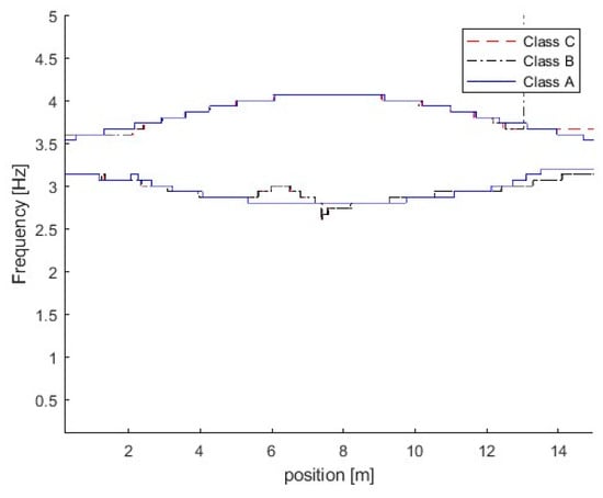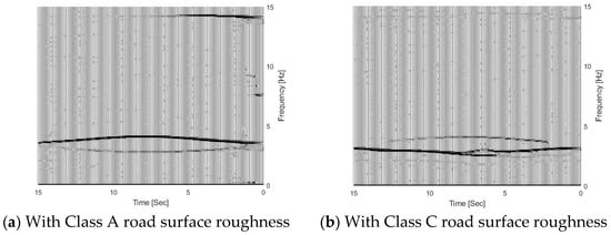 Figure 11 shows the TFRs of the bridge responses for the bridge with different road surface roughness levels. From the figure, three trajectories are extracted successfully from bridge responses using the proposed MSST method. There are two trajectories around 3.5 Hz and the other one is around 14.1 Hz. As the vehicle frequency is 3.2 Hz and it is smaller than the bridge frequency 3.55 Hz, according to Equation (6), the trajectory below 3.5 Hz is the vehicle frequency component, and the trajectory above 3.5 Hz is the bridge frequency component. The TFR with Class A road surface roughness is shown in Figure 10a. In Figure 10a, the bridge frequency trajectory above 3.5 Hz is highlighted with a high energy, and it shows that the bridge dynamic component is dominant in the response. The TFR with Class C is shown in Figure 10b. From the figure, the vehicle frequency trajectory below 3.5 Hz is highlighted with high energy, and it shows that the vehicle dynamic component is dominant in the response. There are some oscillations in the TFRs from the bridge response with Class C road surface roughness. Figure 11 shows the IFs of the bridge responses with different road surface roughness levels. From the figure, the bridge and vehicle IFs are extracted successfully from the bridge responses with different road surface roughness levels.