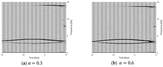In this section, three different damage severities are simulated, e.g., and 0.6, respectively. The damage region parameter is 0.1, the center location of the damage zone lc is at 1/3 L, and m is 2.0. The natural frequencies of the bridge with different damage scenarios are 3.55 Hz, 3.48 Hz, and 3.38 Hz, respectively, and their corresponding vehicle–bridge frequency ratios are 0.90, 0.92, and 0.95. Figure 13 shows the TFRs of the bridge responses with different bridge damage and 0.6, and Figure 3b shows the TFR without the damage, e.g., . Figure 10 shows their corresponding IFs. In Figure 3b and Figure 13, three time-varying frequency trajectories are clearly observed. There are two trajectories around 3.0~3.5 Hz and another trajectory around 14.0 Hz. As shown in Figure 4b, there are two trajectories around 3.5 Hz and another trajectory around 14.1 Hz. The trajectory above 3.5 Hz corresponds to the bridge frequency component as listed in Equation (6), and the highlight shows that the bridge frequency component is dominated in the response. The trajectory below 3.5 Hz is related to the vehicle frequency component. The trajectory around 14.1 Hz is related to the second bridge frequency component. In Figure 13, the trajectories are moving downward when the damage severity parameter increases and the bottom trajectory also becomes dark. The results show that the energy of the vehicle frequency component increases when the bridge frequency approaches the vehicle frequency. When , the first natural frequency of the bridge is 3.38 Hz and that is close to the vehicle frequency of 3.2 Hz. Both trajectories around 3.0 Hz are highlighted and the signal energy is distributed to both the vehicle and bridge dynamic components. The results show that the pattern change in TFRs could be used to indicate structural damage. The results are also confirmed by the IFs in Figure 14. The IFs move downward when the damage severity increases.