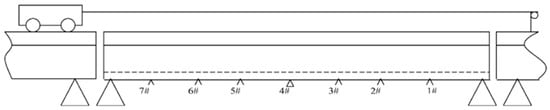 Figure 18 shows the vehicle model on the bridge. The axle spacing of the vehicle is 0.8 m. Two vehicles with different weights are simulated in this study. For the light vehicle, the total weight is 10.60 kN, and the front and rear axle loads are 5.58 kN and 5.02 kN, respectively. For the heavy vehicle, the total weight is 15.06 kN, and the front and rear axle loads are 7.92 kN and 7.14 kN, respectively.