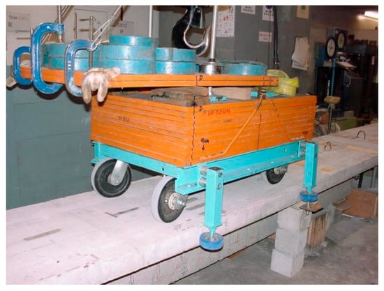 A vehicle–bridge interaction experimental system was built in the laboratory. Figure 17 shows the experimental setup []. The bridge model includes three Tee-section reinforced concrete beams, e.g., the 4.5 m long leading beam, the 5 m long main beam and the 4.5 m long tailing beam. The leading beam is used for the vehicle to accelerate, and the tailing beam is used for the vehicle to decelerate. The gaps between the beams are 10 mm. The vehicle is pulled along the beam by an electrical motor at an approximate speed of 0.5 m/s. Seven accelerometers are installed evenly at the bottom along the beam to monitor the acceleration responses. These seven evenly distributed accelerometers along the length of the bridge are mainly for modal testing. The proposed method is to extract time-varying characteristics from the dynamic responses of the bridge subjected to a moving vehicle. The vehicle is a moving excitor and only one single sensor is needed. In this study, the accelerometer at a 3/8 span of the bridge is used. The single sensor is arbitrarily chosen and the results from the other accelerometers will be similar. The sampling frequency is 2024.292 Hz and the time duration for each test is 30 s.