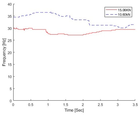 The vehicle with two different weights was studied in this section, e.g., 10. 60 kN and 15.06 kN. Compared with the total mass of the concrete beam of 1050 kg, the mass ratios between the vehicle and bridge are 1.01 and 1.43 for those two vehicles, respectively. The dynamic responses at the middle of the bridge subjected to the moving vehicle are used. The vehicle speed is 0.5 m/s. There is no damage to the bridge, and the natural frequency of the bridge without damage is 30.69 Hz from the modal testing []. Figure 19 shows the IFs extracted from the dynamic responses of the bridge under different weight vehicles using the proposed MSST. From the figure, the IF under the light vehicle is much larger than that under the heavy vehicle. This result indicates that the proposed method could successfully extract the time-varying characteristics of the bridge under a moving vehicle.