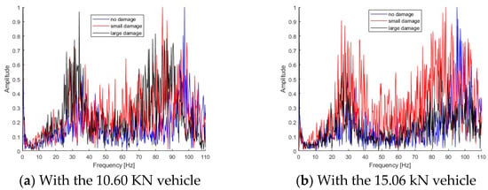 Small and large damage scenarios have been created using the static loading as shown in Section 4.1. Figure 20 shows the Fourier spectra of dynamic responses for the bridge under a moving vehicle. Figure 20a shows the Fourier spectra of bridge responses with different scenarios subjected to a light vehicle, and Figure 20b shows the spectra with a heavy vehicle. As seen in Figure 20, there are two peaks in the spectra and they are around 30 Hz and 95 Hz.