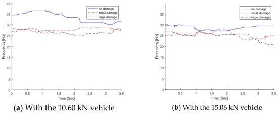 In practice, the modal testing is normally conducted under ambient conditions, and the bridge needs to be closed. In operational environments, the frequency change due to damage may be much smaller than that due to operational and environmental variations. From the modal testing, the first natural frequencies of the bridge with no damage, small damage, and large damage are 30.69 Hz, 27.02 Hz, and 25.7 Hz, respectively []. In this study, the proposed method is used to extract the time-varying characteristics from the dynamic responses of the bridge subjected to a moving vehicle. As shown in Figure 21, the frequency variation with the passage of the vehicle for the light vehicle is between 28 and 30 Hz for small damage and that for the heavy vehicle is between 24 and 26 Hz. The frequency variation due to damage is at the same level as that due to the passage of the vehicle. The damage cannot be detected by the frequency change only. A previous study has also shown that the vehicle passing over the damage zone would induce the local nonlinear response due to the crack being open or closed []. The change in the dynamic responses of the bridge due to damage could be amplified by the presence of the vehicle on top. The frequency change pattern is a potential indicator for structural damage. Leveraging the time-varying features, further study will be conducted for structural damage detection using machine learning models.