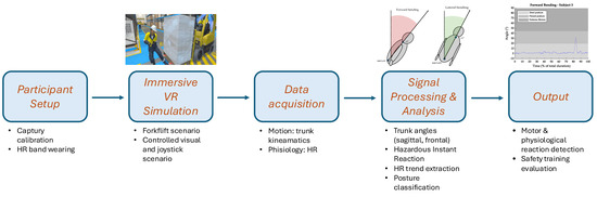 Block diagram of the experimental workflow. The diagram illustrates the sequential phases of the study: participant setup, immersive VR simulation involving a hazardous event (sudden forklift appearance), real-time data acquisition of physiological and motor signals (heart rate and trunk kinematics), signal processing and analysis, and outcome interpretation for evaluating safety training effectiveness.