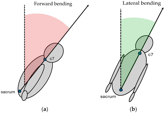 Trunk flexion is assessed by projecting the sacrum–C7 vector onto anatomical planes. Forward trunk bending (a): the vector is projected onto the sagittal plane, and the trunk angle (in red) quantifies the deviation from the orthostatic posture (dashed line). Lateral trunk bending (b): the same vector is projected onto the frontal plane, and the trunk angle (in green) quantifies the lateral deviation from the orthostatic posture (dashed line).